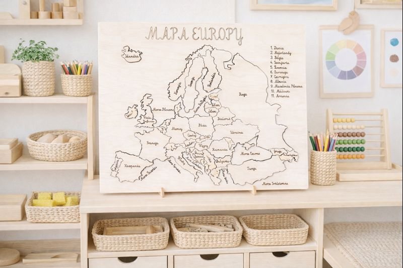 Mapa doskonale sprawdzi się nie tylko jako stylowa dekoracja domu, biura czy gabinetu, ale również jako narzędzie edukacyjne w przedszkolu i szkole. Ułatwia dzieciom poznawanie krajów Europy, rozwija ciekawość świata, wyobraźnię przestrzenną oraz zainteresowanie geografią w atrakcyjnej, naturalnej formie.