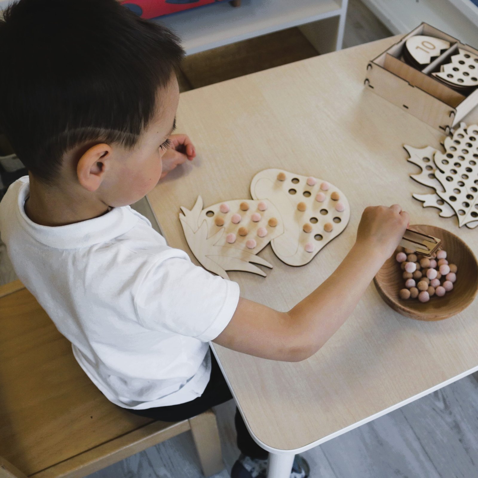 Podczas umieszczania pomponów w wyznaczonych otworach przy pomocy szczypców dzieci ćwiczą precyzję i kontrolę ruchów, tworząc wielozmysłowe doświadczenie edukacyjne.