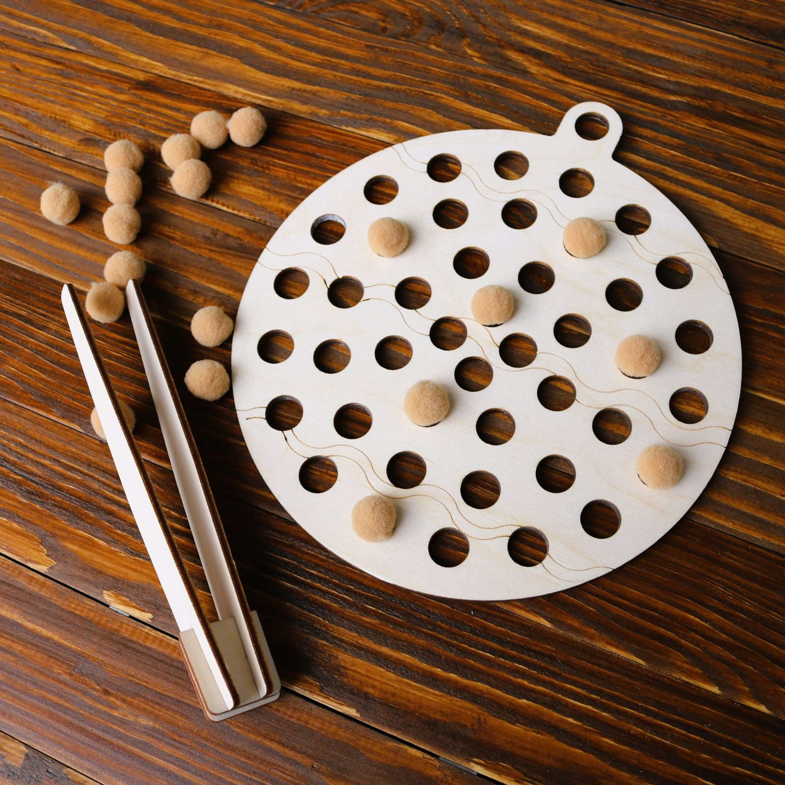 Ta prosta i atrakcyjna układanka to świetny sposób na połączenie nauki i zabawy. Zadaniem dziecka jest umieszczanie pomponów w otworach drewnianej planszy.