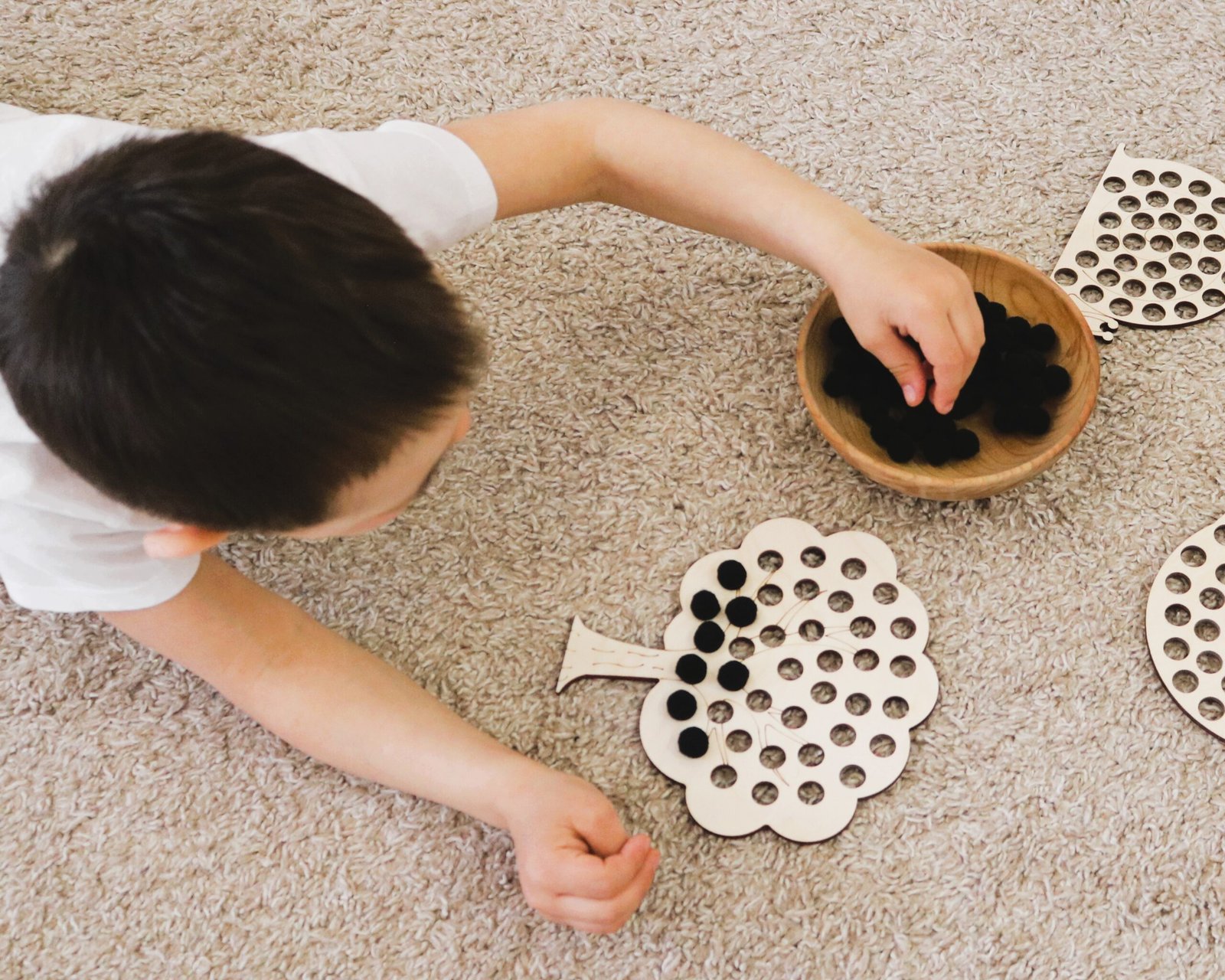 Ta prosta i atrakcyjna układanka to świetny sposób na połączenie nauki i zabawy. Zadaniem dziecka jest umieszczanie pomponów w otworach drewnianej planszy.