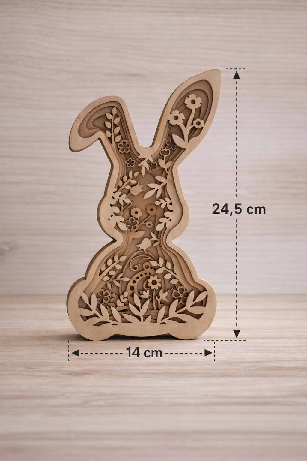 Zajączek został wykonany z wysokiej jakości naturalnego drewna, co sprawia, że każdy egzemplarz jest unikalny – z widocznym, niepowtarzalnym usłojeniem oraz delikatnymi różnicami w strukturze materiału. Drewno jest przyjemne w dotyku, trwałe i ekologiczne, dzięki czemu dekoracja doskonale wpisuje się w ideę życia w zgodzie z naturą.