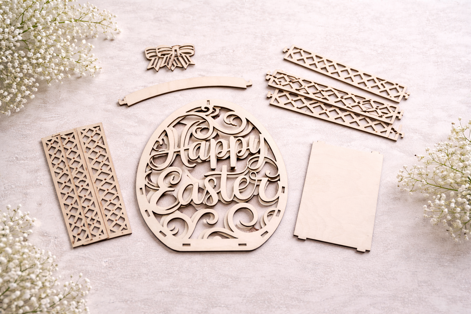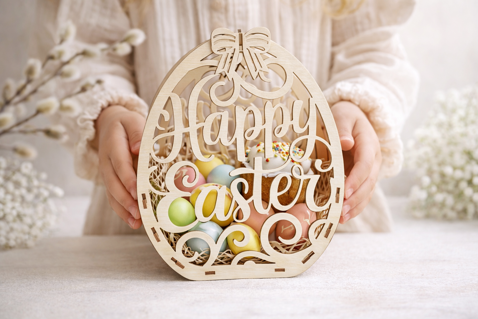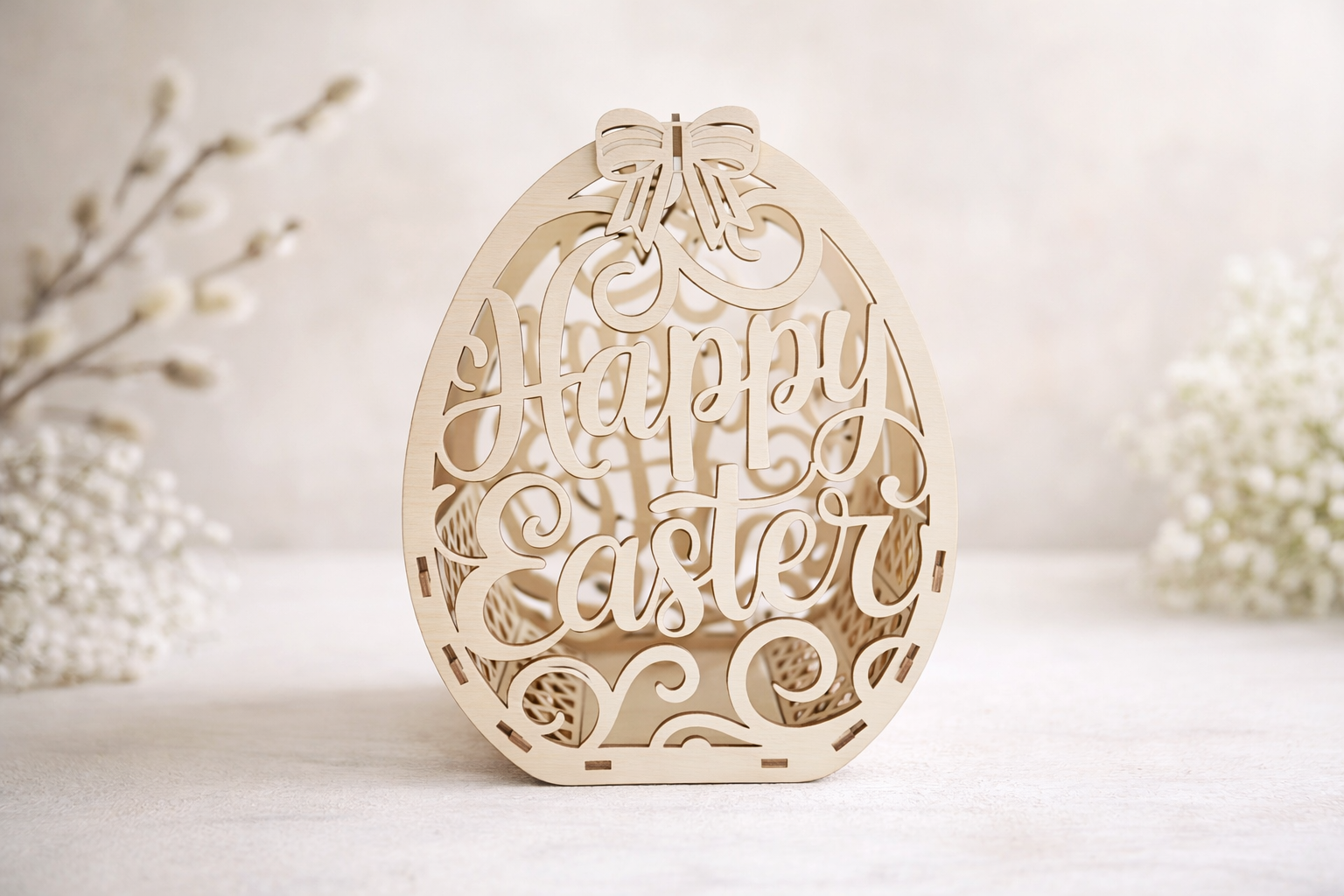 Elegancki drewniany koszyk wielkanocny wykonany z jasnej, naturalnej sklejki. Produkt wyróżnia się subtelnym, ażurowym wzorem w kształcie wielkanocnego jajka oraz dekoracyjnym napisem „Happy Easter”, który nadaje mu świąteczny i estetyczny charakter.