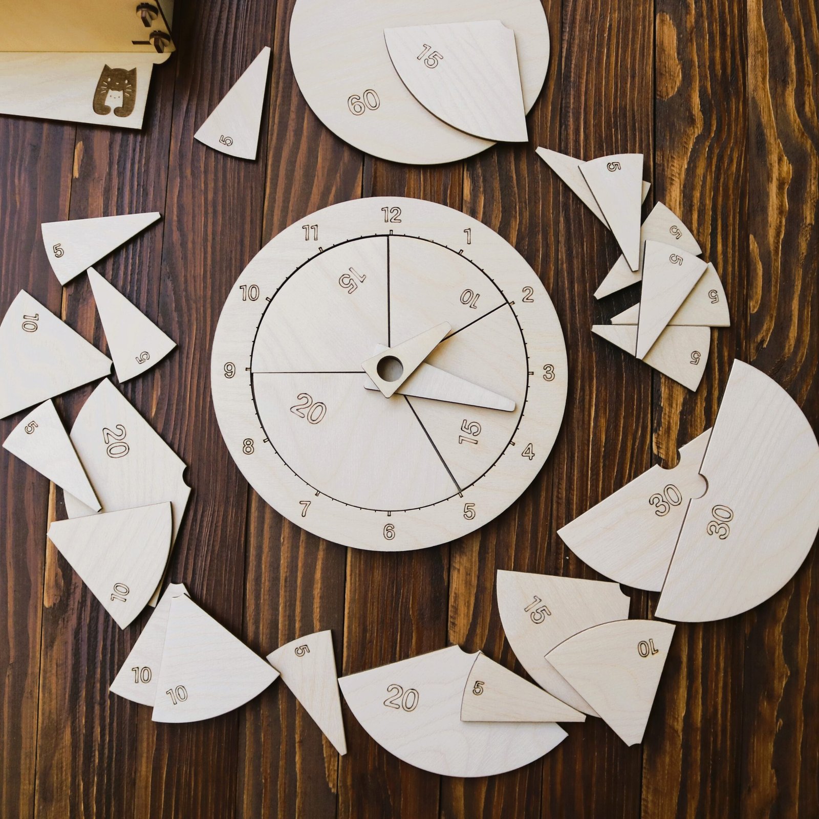 Zegar, ułamki i pudełko są wykonane z wytrzymałej sklejki brzozowej.