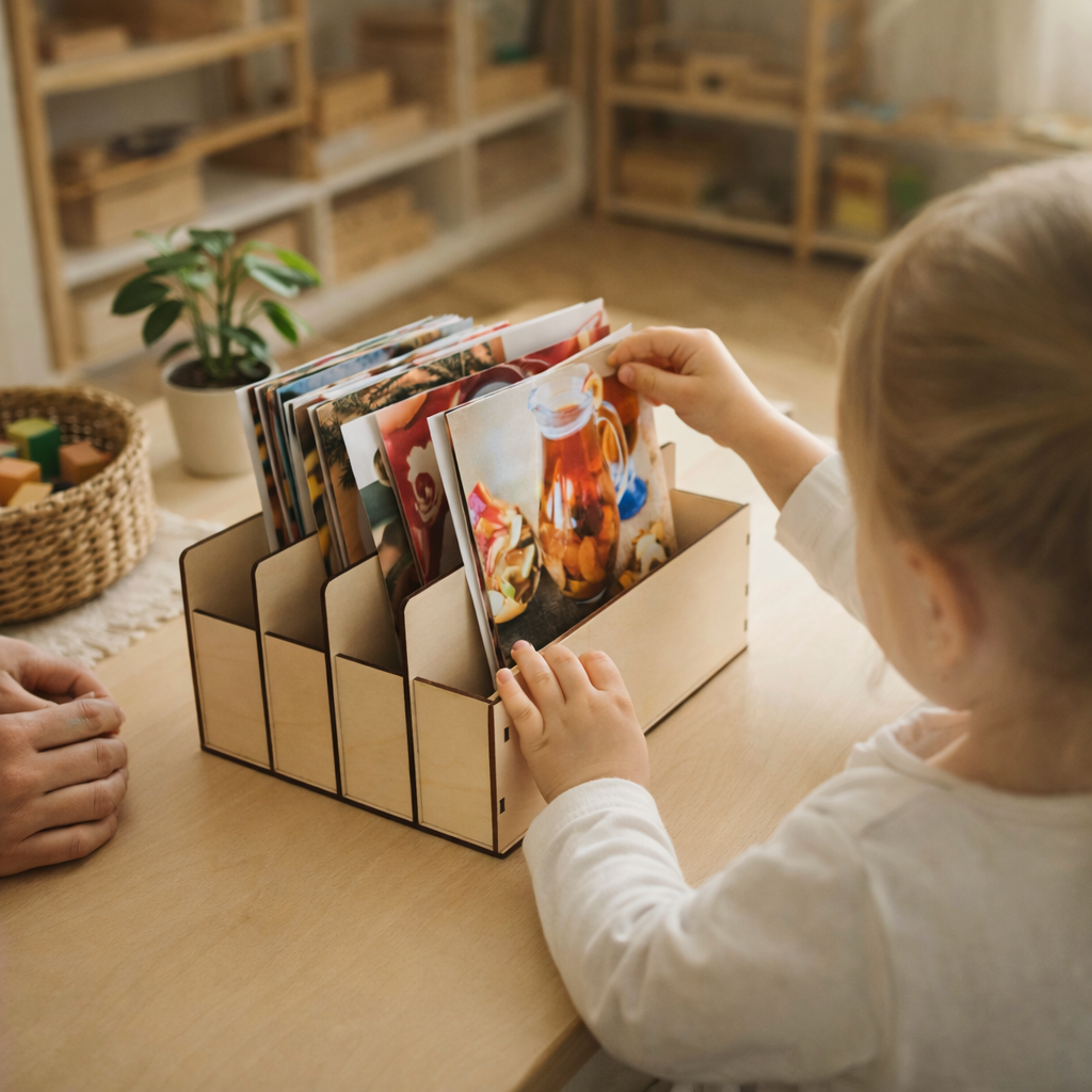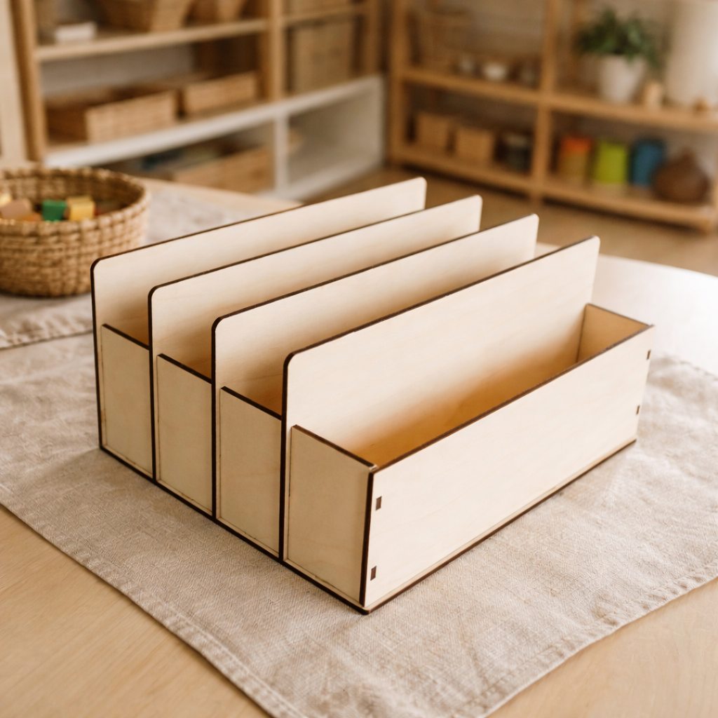 To pudełko to doskonały dodatek do materiałów językowych Montessori – wspiera porządek, koncentrację i niezależność dziecka w nauce.